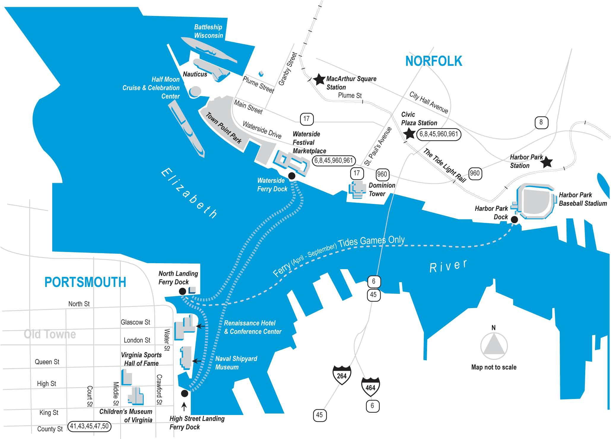 HRT operates three 150-passenger ferries on the Elizabeth River between Norfolk and Portsmouth. They're fast, economical and offer a unique view of the river and the waterfront. Ferries operate every 30 minutes with 15-minute service during the summer at peak times on weekends. The ferry is wheelchair accessible and allows boarding passengers to walk on with their bicycles.